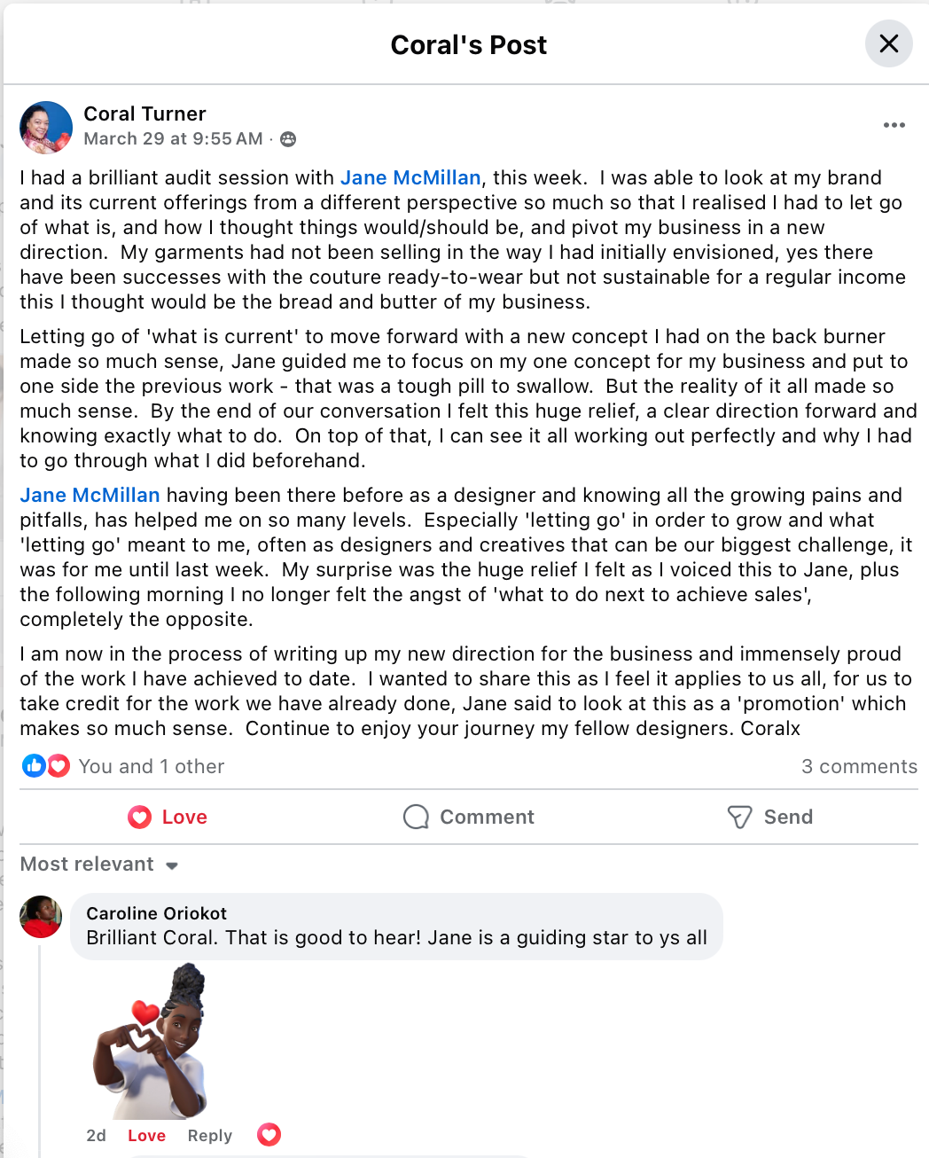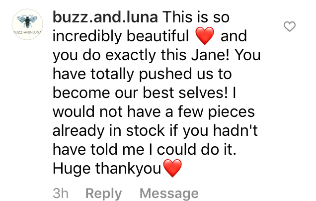 “Jane McMillan, having been there before as a designer and knowing all the growing pains and pitfalls, has helped me on so many levels.  Especially letting go in order to grow"”